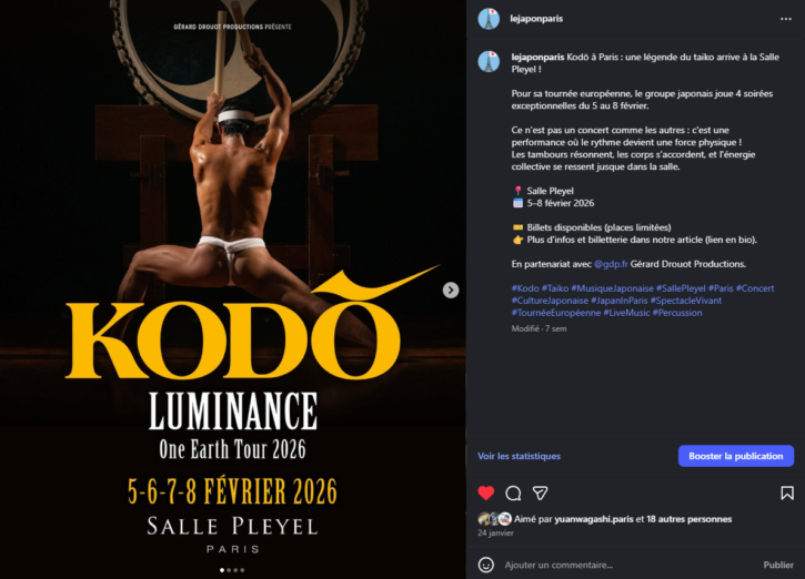 Objectif : promouvoir un concert-spectacle des tambours japonais Kodô à Paris.